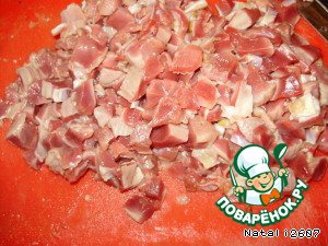 Итак, снять осторожно кожу, перерубить кость у основания ножки. Куриные желудки нарезать кубиком.