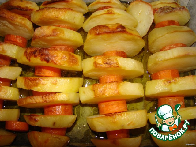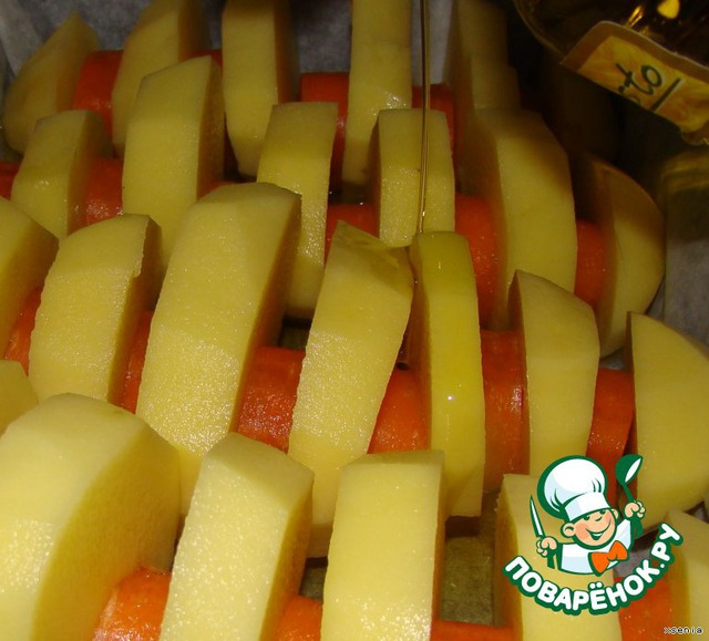 И выкладывем картофель, чередуя с морковью... так чтобы крайние кружочки упирались в бортики -