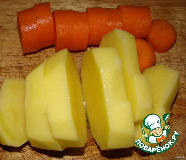 Режем картофель и морковку кружочками не менее 1 см шириной