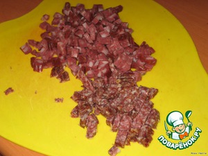 - Колбаса (копченая, у меня было два маленьких кусочка разного вида) — 150 г