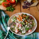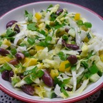 Вкусный, интересный вариант салата. Но для меня - много углеводов, диабет. То, что у меня на тарелке, можно съесть лишь половину и будет полноценный обед. От себя добавила помидор, вместо пекинки - лист салата. И на мой взгляд, надо что-то одно, либо горошек, либо фасоль.