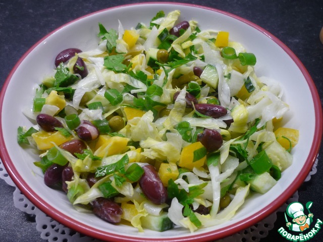 Готовила без лука и петрушки, добавив больше укропа. Я тоже не стала добавлять зеленый горошек. Мне хватило фасоли. В целом получился вкусный салатик.