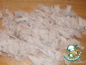 Куриную грудку отварить, остудить и нарезать кусочками.