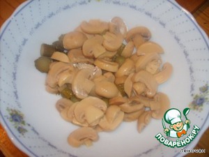 Количество ингредиентов по желанию. Корнишоны крупно порезать, шампиньоны – пластинками.