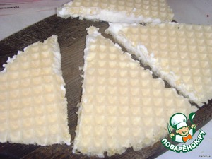 Разделить полученную массу на 2 части и намазать на два вафельных коржа.