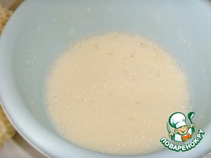 Для кляра взбить 2 белка, одно целое яйцо, 100 мл молока и 1 ст. л. сахара.