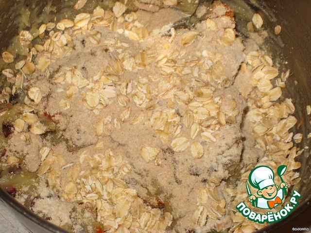 Добавить овсянку и гречневую муку смешанную с разрыхлителем, перемешать.