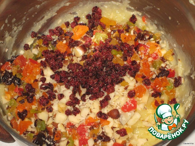 В заварную массу добавить цукаты, сушеную смородину и рубленые орехи перемешать.