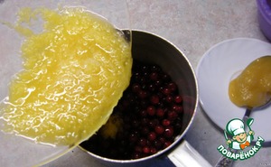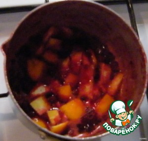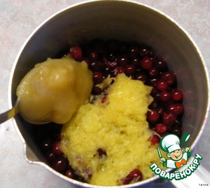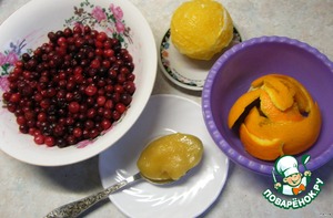 В кастрюльку положить клюкву,добавить измельченный апельсин и мед.Варить на небольшом огне 15 минут.
