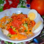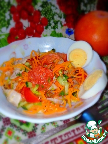 потом добавить черри, порезанные на половинки, яйца порезанные четвертушками, салат полосками, порезанный огурец, морковь, натёртая на тёрке для корейской моркови, посолить, поперчить, заправить оливковым маслом.