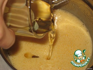 Не переставая взбивать, влить растительное масло.