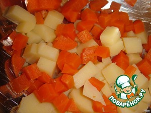 Грибы порезать также кубиками. У меня были смешанные, пособирала остатки со всех баночек.