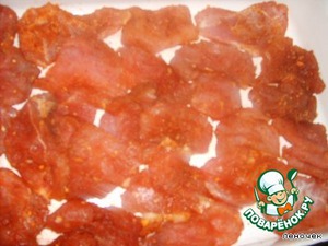 Мясо нарезать ломтиками и натереть чесноком, солью и перцем (или Вашими любимыми приправами)