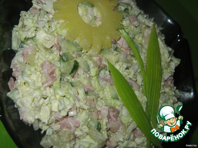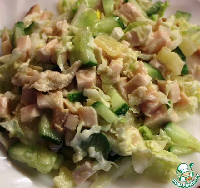 Очень вкусный салатик. Советую всем от всей души!!!:))) Свежее сочетание пекинской капустки и свежими огурчиками, с сладковатой ноткой ананаса и пикантностью копченого мяса...