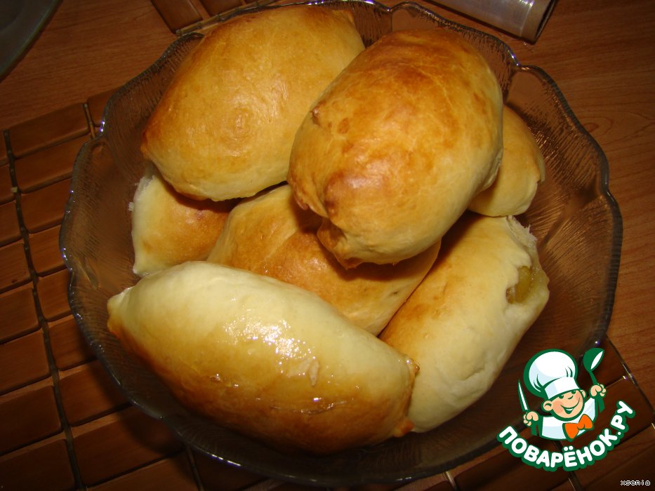 Тесто разделить на 20-22 кусочка, размять руками, положить в серединку начинку и защипать края.Уложить на противень застеленный пекарской бумагой.Выпекать при температуре 200-220гр около 20-25 минут.Готовые пирожки смазать водой и накрыть тканевой салфеткой.