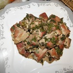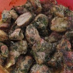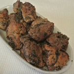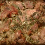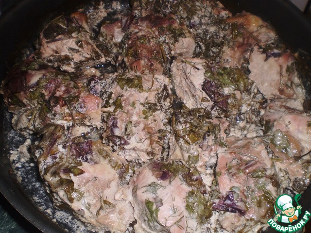 Мясо режем крупными кусками, зелень режем не очень мелко. Из зелени у меня свежие были укроп и петрушка, а базилик и розмарин я взяла сухой, где-то по 1 ч. л с горкой. Кинзу я заменила на молотый кориандр (т. к. в натуре я ее не люблю)