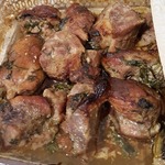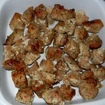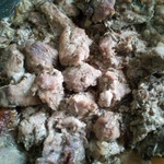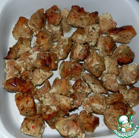 [+4]Я в целом придерживался основной линии, но сделал так: мясо - бедро индейки (600 г.) и свиные медальоны (300 г.), куски средние, ближе к крупным.