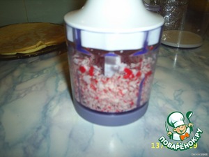 Готовим крем. Измельчаем в блендере креветки, крабовые палочки. -
