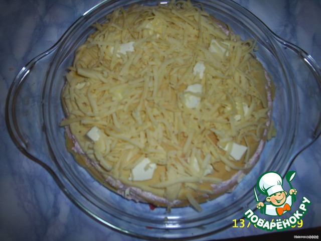 Когда все блины смазаны, верх посыпаем тертым твердым сыром и укропом.