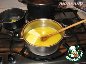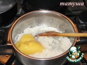 В кастрюльку засыпать сахар, добавить 2 ст. л. воды, мед - все растворить и готовить на небольшом огне, помешивая, пока не карамелизуется.
