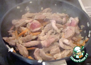 Масо порежьте мелко... потрите морковку... порежьте лук... и обжарьте до готовности на сковородке, помешивая