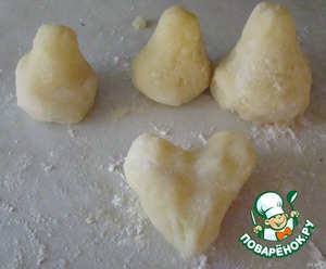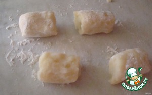 с помошью муки скатайте колбаску из картофеля... разрежьте на нужное количество частей -