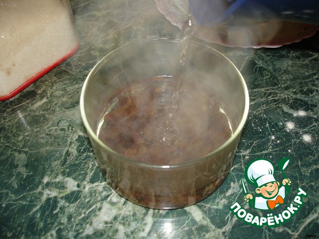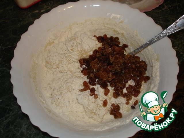 В тесто добавить ошпаренный изюм изюм, перемешать.