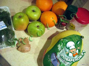 3. Положить четвертинки апельсина и четвертинки одного яблока внутрь тушки вместе с несколькими веточками укропа и небольшим кусочком очищенного имбиря.