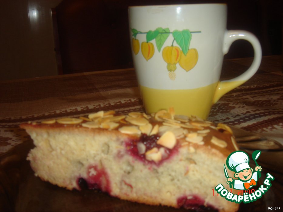 Добавить размороженные и отцеженные ягоды вишен (по объему я брала бульонную чашку 0,5 л). Посыпать сверху миндальными хлопьями. |