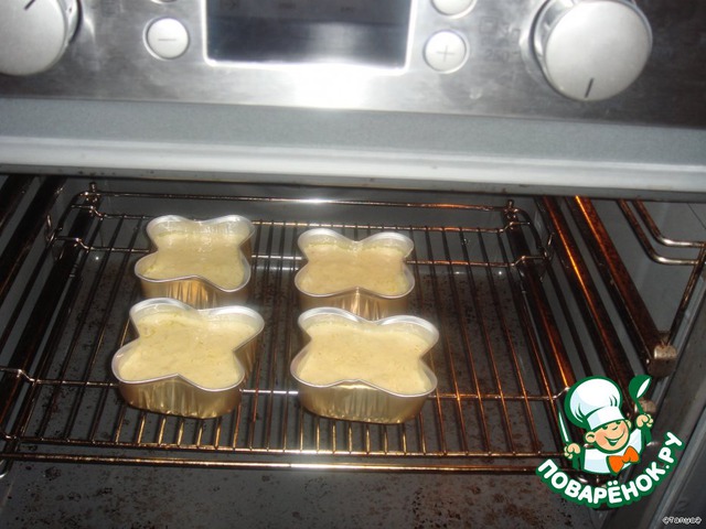 Тесто разлить по формочкам и выпекать в духовке при 180 градусах в течение 40-50 мин.