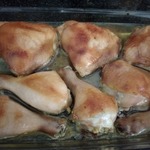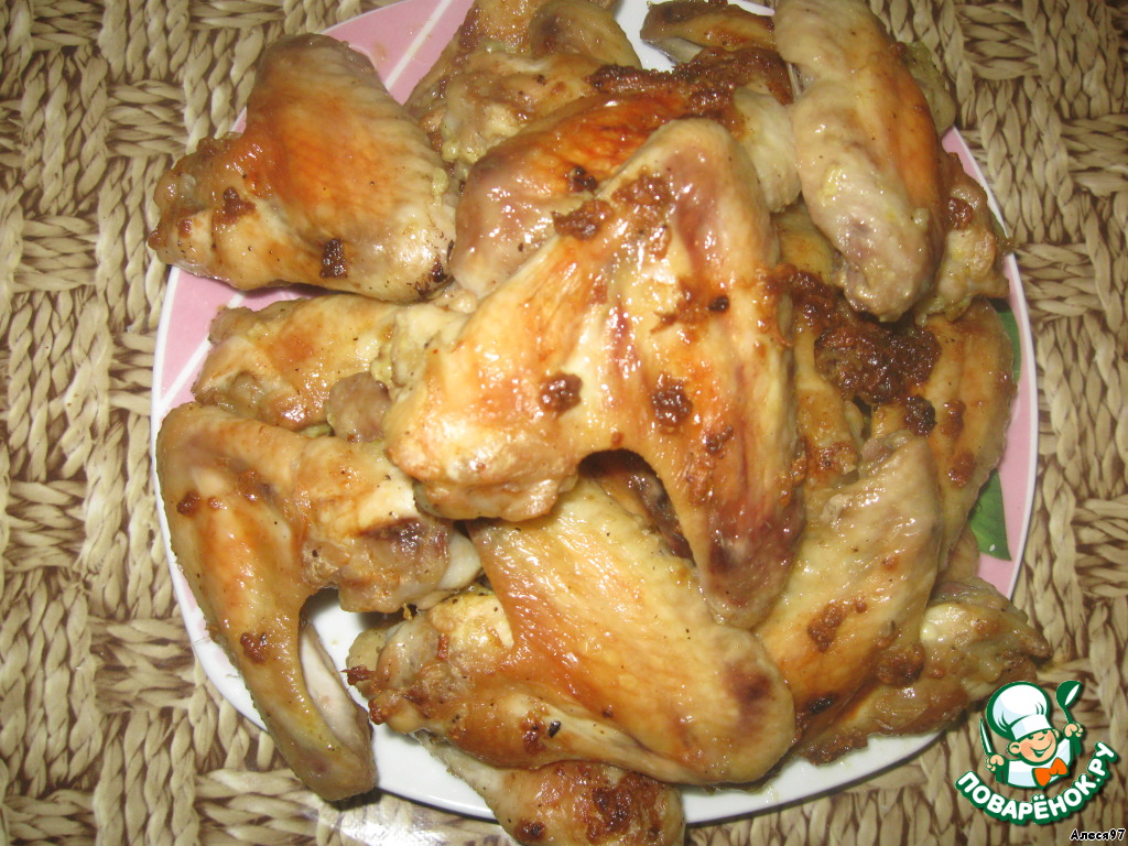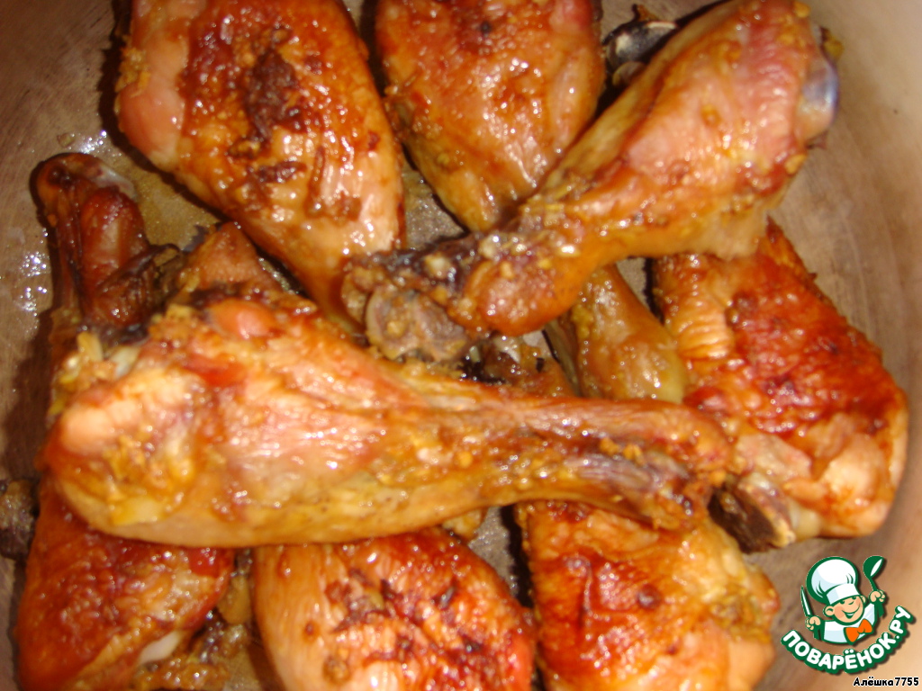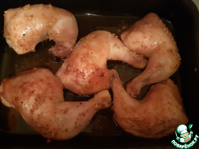 Подготовленные окорочки я смазала натертым чесноком, сверху полила полученной смесью (чтобы жидкость попала на каждый кусочек).