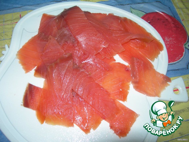 Семгу нарезать пластинками и добавить в миску с салатом.