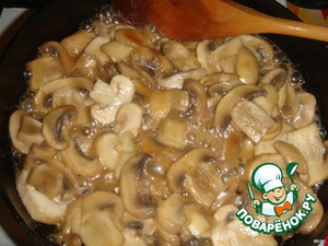 Шампиньоны порезать пластинками и обжарить на сливочном масле. Добавить вино и протушить пару минут.