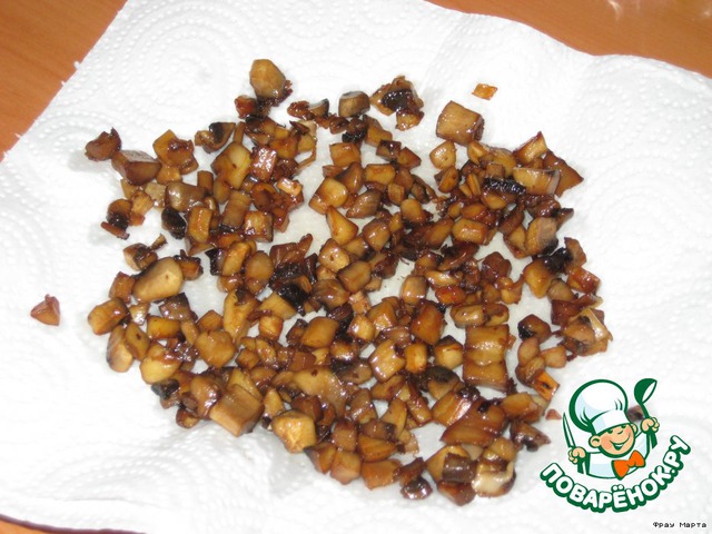 Грибы некрупно нарезать и обжарить на растительном масле, затем выложить их на салфетку, чтобы стекло масло.