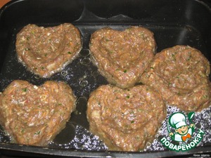 Сформировать из фарша котлетки в виде сердца, но в серединке оставить углубление для начинки.