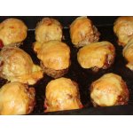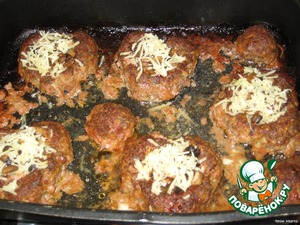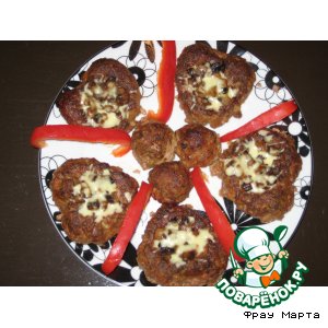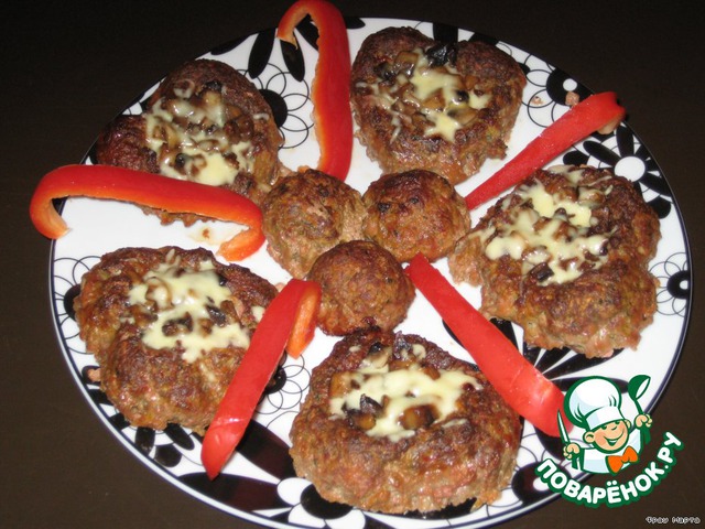 Через 40 минут достать уже готовые котлеты, в углубления кладем грибы, сверху посыпаем сыром и в духовку минут на 7-10, чтобы сыр хорошо расплавился.