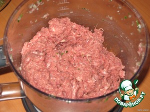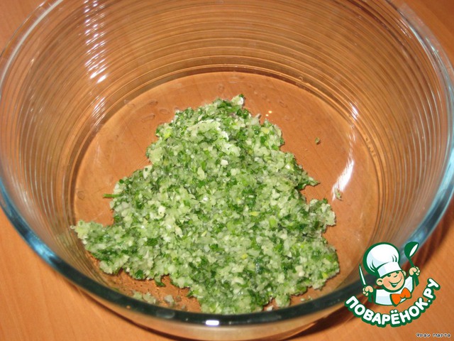 Перемолоть в блендере лук, чеснок и зелень (можно то же самое сделать на мясорубке).