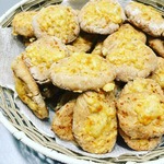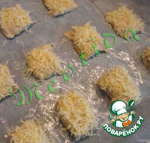 каждую печенюшку обмакиваем с одной стороны во взбитое слегка яйцо, а затем в тертый сыр и выкладываем на противень
