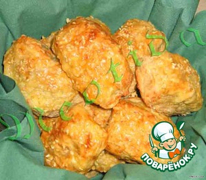 Какое блаженство – выпить утром чашечку ароматного кофе с пряными ломтиками сыра. слияние волнующих запахов хорошего кофе и тонкой пикантности качественного сыра – это настоящий рай, для гурманов… ну а если в холодильнике лежит кусочек самого обычного Российского сыра, то фееричную нежность и пряность можно придать ему, если Вы испечете такие вот воздушные сырные вкусняшки, добавив в тесто соевый соус, немного свежего имбиря, пряных специй и посыпав все кунжутом…