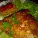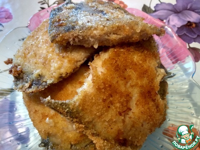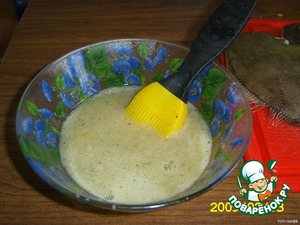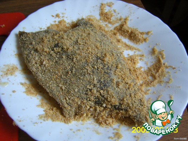 Выпотрошенную и промытую камбалу обмазала с обеих сторон и внутри яичной смесью и запанировала сухарями.