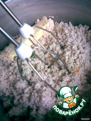 положить масло и все взбить миксером.Если масса будет распадаться,то добавить или масла,или бульон.Если специй каких-то,на ваш взгляд,будет не хватать,то добавьте на свой вкус.