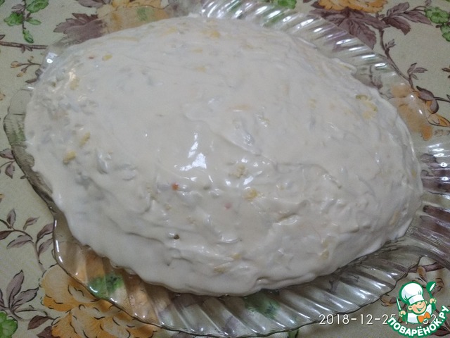 морковь натереть на мелкой терке и снова смазать слой майонезом.