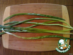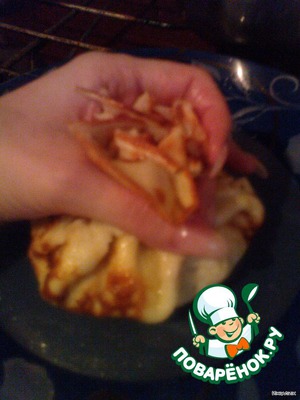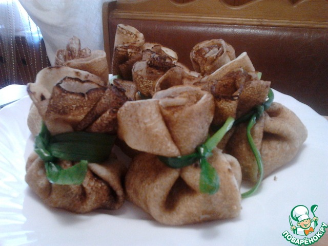Затем собираем блинчик и немного сдавливаем его, чтобы лук хорошо завязывался и не соскальзывал.