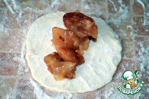 Раскатать очень тонкую лепешку, положить на неё начинку,