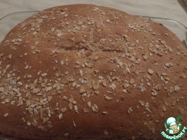 как тесто подойдет во второй раз, формуем круглую буханку, делаем острым ножом надрез сверху крест на крест, смазываем молоком и посыпаем овсяными хлопьями. -