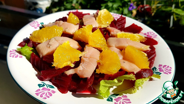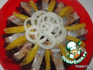Кладём лук на середину блюда, поливаем всё апельсиновым соком.