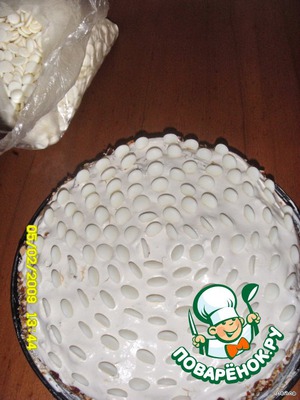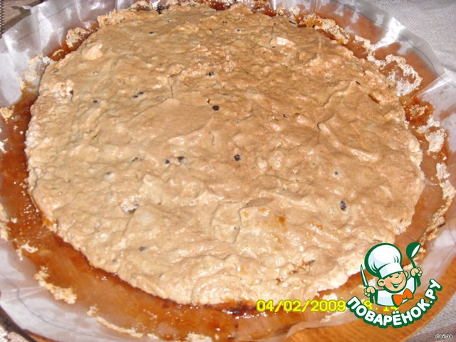 Намазать на нее половину белковой массы и выпекать около 30 мин. Затем так же испечь и второй корж-безе. -