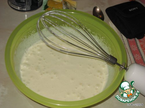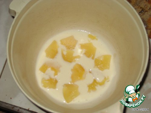 Желатин растворяем в соке от ананасов (так просто вкуснее). Сметану для крема взбиваем с сахаром и добавляем растворенный желатин, постоянно помешивая крем.