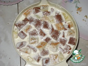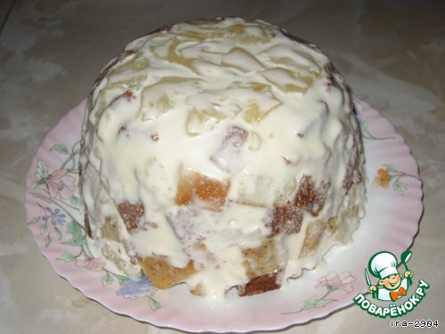 Далее кубики, потом опять крем, ананасы, опять кубики. Чередуем все по порядку.