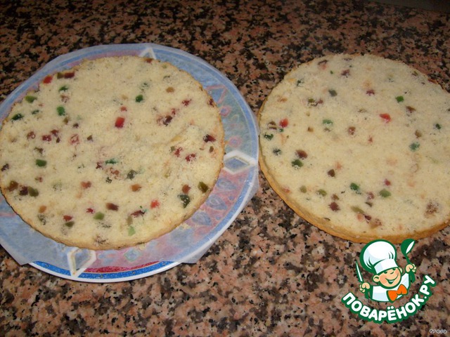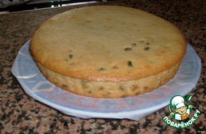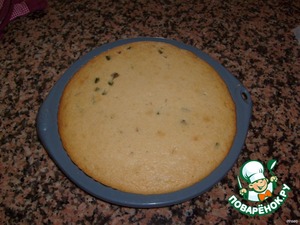 Когда пирог испечется, разрезаем его пополам, пропитываем сиропом, посыпаем сахарной пудрой